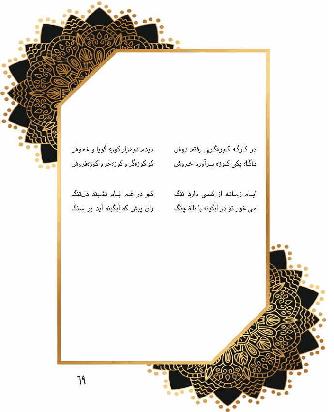 نکته مهم این است که این کتاب برای فارسی زبانان خارج از کشور طراحی شده است و برعکس تمام کتابهای شعر موجود که با خط نسطعلیق و یا شکسته نوشته شده و برای بعضی از ما دشوار است این کتاب با فونت بسیار زیبایی همینطور که می بینید نوشته شده که نه تنها زیبایی خود را از دست نداده است بلکه می توان ساده آن را خواند. حتی کودکان ما میتوانند از خواند آن لذت ببرند.